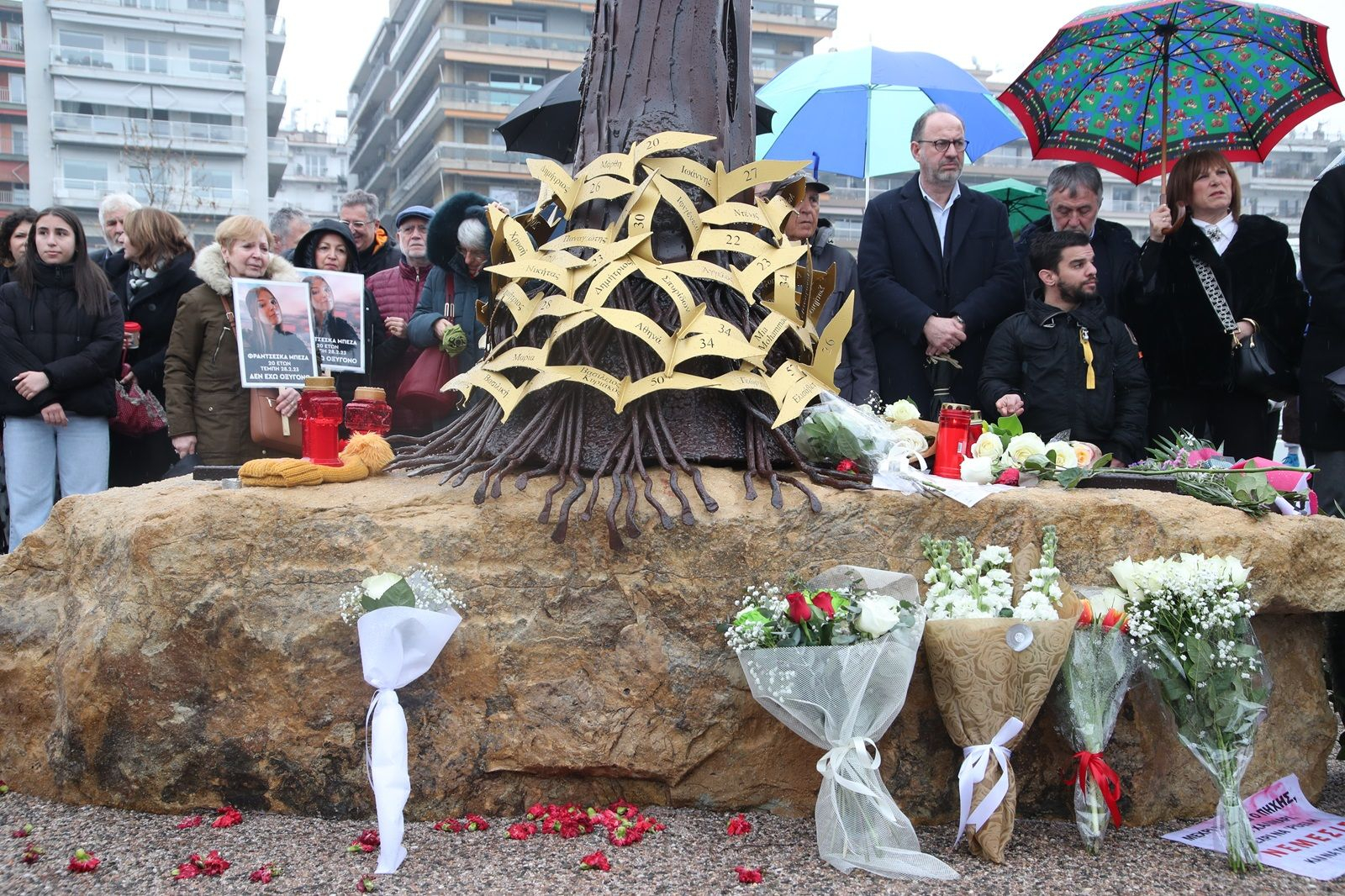 Σε κλίμα συγκίνησης πραγματοποιήθηκαν το μεσημέρι σε χώρο πρασίνου στη Νέα Παραλία της Θεσσαλονίκης τα αποκαλυπτήρια του γλυπτού με τίτλο «Το Δέντρο της Μνήμης», που είναι αφιερωμένο στα 57 θύματα των Τεμπών.