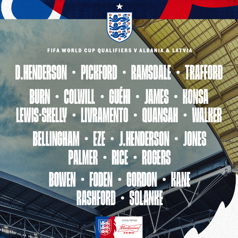 Η αποστολή της Αγγλίας για τα ματς με Αλβανία και Λετονία.