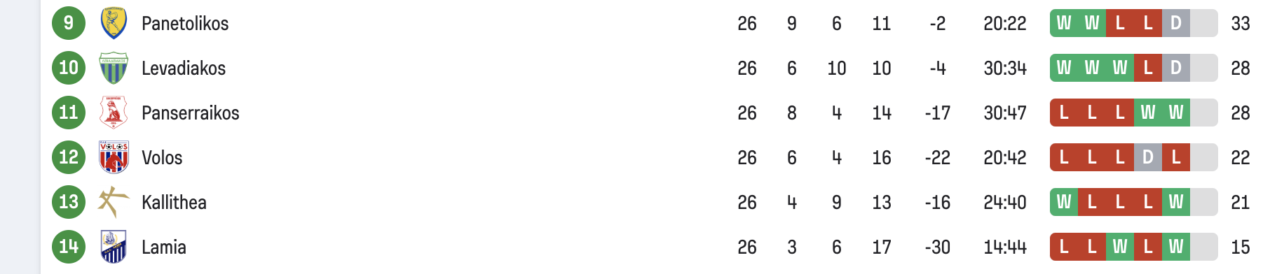 Η βαθμολογία μετά τους αγώνες για την 2η αγωνιστική των Playouts για την αποφυγή του υποβιβασμού έχει ως εξής: