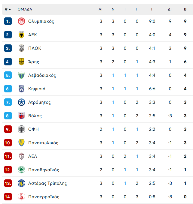 Έτσι βρίσκεται στην κορυφή του βαθμολογικού πίνακα μαζί με Ολυμπιακό και ΠΑΟΚ που επίσης μετρούν μόνο νίκες μέχρι στιγμής.