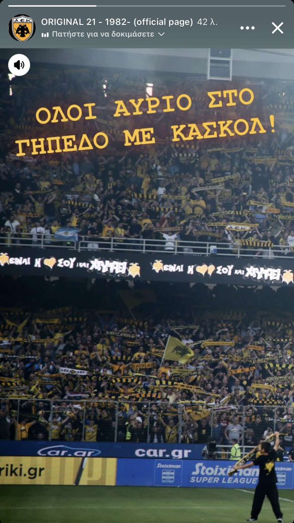 Μήνυμα στον κόσμο της ΑΕΚ που θα βρεθεί αύριο στο γήπεδο για το ντέρμπι με τον ΠΑΟΚ έστειλε η Original 21. Οι οργανωμένοι φίλοι της Ένωσης μέσω social media προέτρεψαν τους Ενωσίτες να έχουν ΟΛΟΙ κασκόλ μαζί τους στο ματς με τους Θεσσαλονικείς!