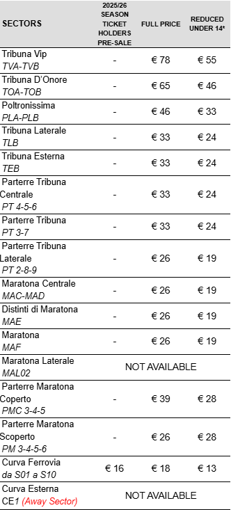 Η ιταλική ομάδα ανακοίνωσε τις τιμές και τους όρους διάθεσης, τονίζοντας πως τα εισιτήρια της εξέδρας φιλοξενουμένων θα δοθούν αποκλειστικά από την ΑΕΚ