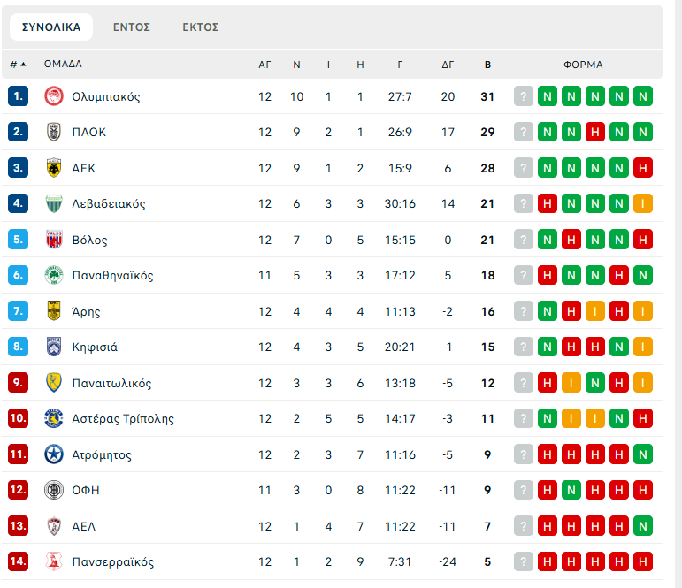 Εκεί βρίσκεται ο Ολυμπιακός που πέρασε από το Αγρίνιο και ανέβηκε στους 31 βαθμούς, ενώ ο ΠΑΟΚ νίκησε στο φινάλε στη Λειβαδιά και παρέμεινε 2ος με 29 βαθμούς.