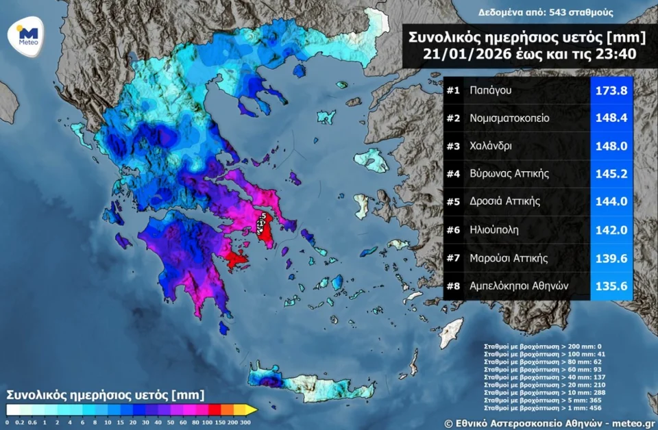 Στον παρακάτω χάρτη αποτυπώνονται τα συνολικά ύψη βροχόπτωσης έως τις 23:40 της Τετάρτης 21/01/2026, όπως αυτά καταγράφηκαν από 543 μετεωρολογικούς σταθμούς του δικτύου αυτόματων μετεωρολογικών σταθμών του Εθνικού Αστεροσκοπείου Αθηνών / meteo.gr, ενώ επισημαίνονται τα 8 μεγαλύτερα.