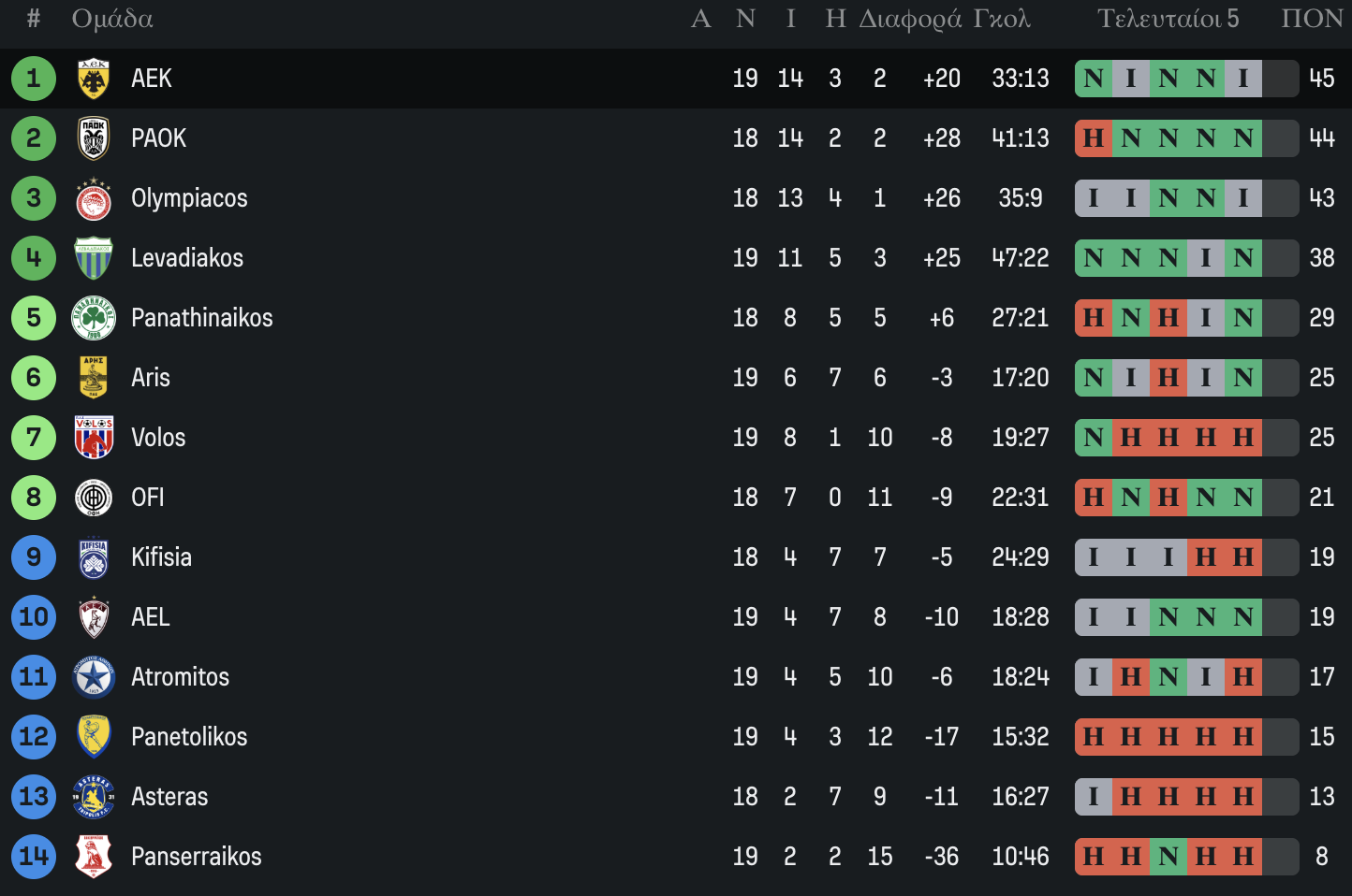 Αναλυτικά η βαθμολογία της Super League μετά τους αγώνες για την 19η αγωνιστική έχει ως εξής: