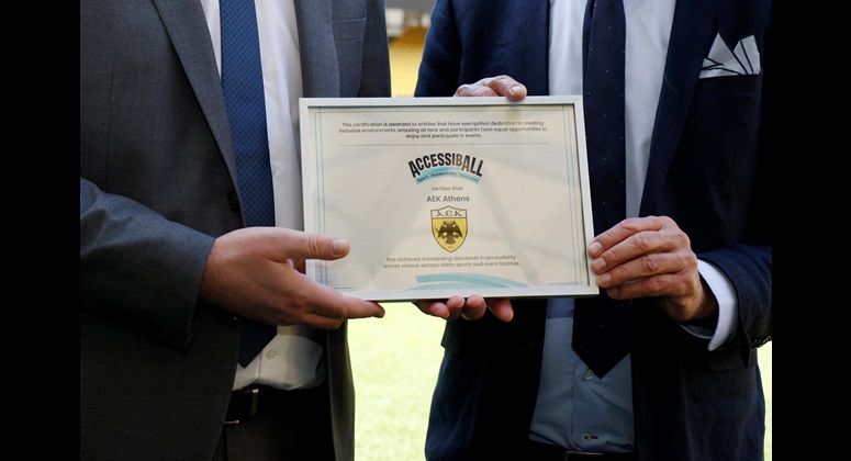 Τον Διεθνή Οργανισμό AccessibALL εκπροσώπησαν στη σημερινή τελετή στην ALLWYN Arena ο CEO κ. Ολιβιέ Γιάροζ και ο Παγκόσμιος Σύμβουλος (πρώην πρόεδρος της Ελβετικής Ομοσπονδίας Ποδοσφαίρου) κ. Ντομινίκ Μπλανκ. Την ΠΑΕ ΑΕΚ εκπροσώπησαν και παρέλαβαν την πιστοποίηση ο Α’ Αντιπρόεδρος και Διευθύνων Σύμβουλος κ. Μηνάς Λυσάνδρου και η Γενική Διευθύντρια κα Αγγελική Αρκάδη. Τα δύο στελέχη του οργανισμού ξεναγήθηκαν στους χώρους του γηπέδου, ενώ επισκέφθηκαν και τα Μουσεία Προσφυγικού Ελληνισμού και Ιστορίας της ΑΕΚ.